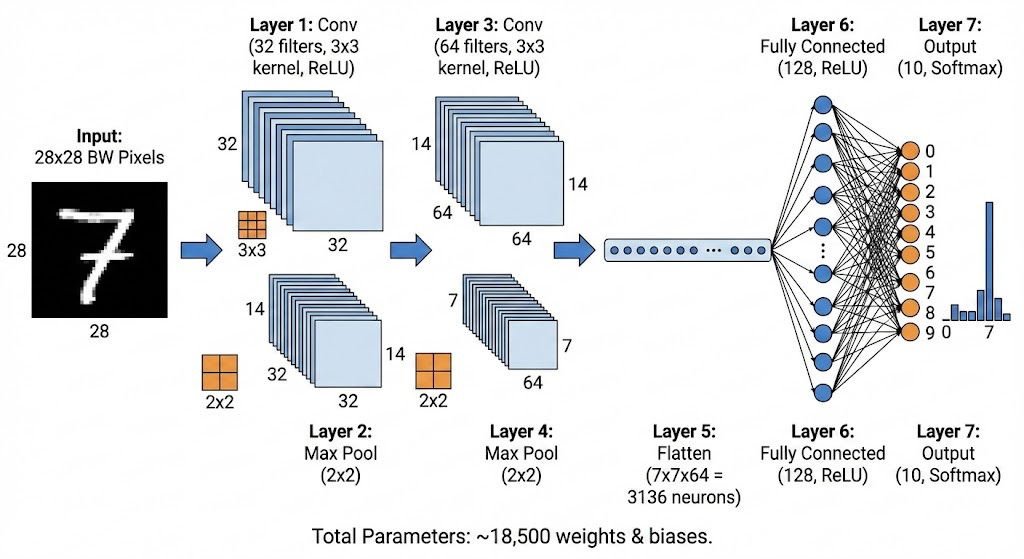 Spatial Context: Since each kernel examines a pixel alongside its neighbors (not just the pixel alone), it can detect patterns that depend on spatial relationships. A horizontal line of bright pixels might indicate an edge, while a cluster of dark pixels surrounded by light ones might indicate a corner. Traditional neural networks lose this spatial information when they flatten the image.
