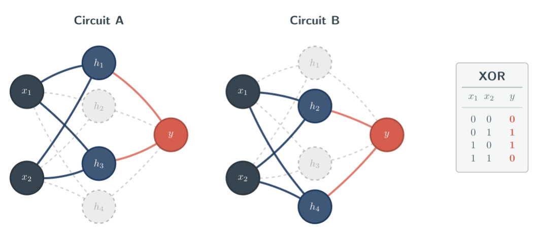 I’ll be brief here. As a setup for our experiments, we used a 2-4-1 multi-layer perceptron (2 input neurons, 4 hidden-layer neurons, 1 output neuron) trained on the Boolean XOR task. The use of a small ‘toy’ MLP made the process of circuit enumeration and validation much easier. The Boolean XOR task was convenient due to its synthetic, simple, and non-linear nature. Note that while we did vary the hidden-layer width and tasks during experimentation, the above specifications were the base scenario.